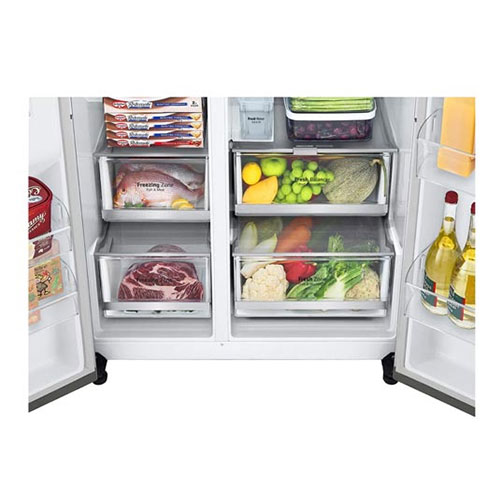 همان گونه که ظاهر این دستگاه ال جی برای خریدار مهم است. فضای داخلی آن نیز مهم بوده و به آن حتی توجه بیشتری می شود. یخچال در سمت راست قرار دارد و فریزر در سمت چپ آن قرار داده شده است. درب های یخچال و فریزر که به صورت مستقل از هم هستند. با باز کردن هر درب به فضای داخلی آن دسترسی خواهید داشت.